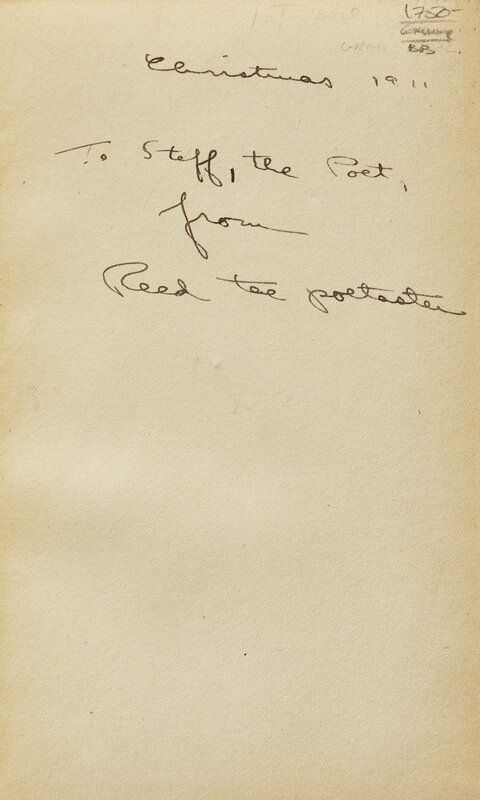 Boston: Small, Maynard and Company, (1910). First edition, first impression. Inscribed on front free endpaper by radical American journalist John Reed to American journalist--and leading muckraker of the period--Lincoln Steffens: "Christmas 1911 / To Steff, the Poet, / from / Reed the poetaste". Original printed tan paper-covered boards, spine slightly darkened, small stain bottom of front board; text partially unopened; without the rare dust-jacket; in quarter crimson morocco slip case and chemise. Gallup A6