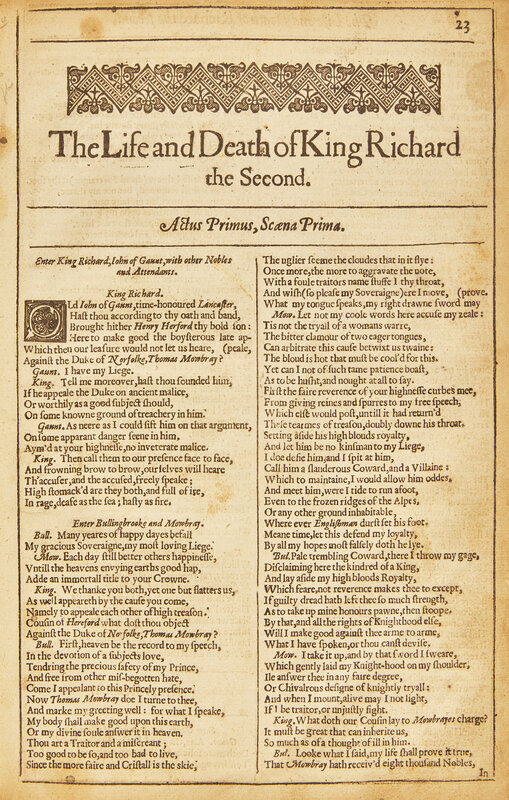 Bound within leaves from the Second Folio (London, 1632), comprising: the complete first and second parts of Henry the Fourth (pp. 46-100), plus the leaf of the Epilogue (i2r) and The Actors Names (i2v), as well as the complete first act of The Life and Death of King Richard the Second (pp. 23-45). Together bound in full blue linen-covered boards, black morocco spine label, stamped in gilt; all edges trimmed; spotting and soiling to text; closed tear in bottom edge c2; old repaired closed tear in bottom edge d1; repaired closed tear in bottom edge of d6 and e1 from the Second Folio; repaired open tear bottom edge f6. Pforzheimer 905 and 906; Grolier English 19; Printing and the Mind of Man 122