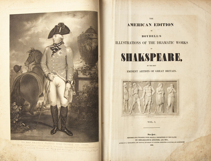 Rare complete set of the first American edition of John Boydell's (1719-1804) monumental illustrations for the works of Shakespeare. First published in 1805, Boydell's project was nearly 20 years in the making, and utilized some the period's finest engravers to complete these fine and large plates. Spooner, an American dentist, purchased Boydell's original plates in the 1840s and restored them for the publication of this edition.