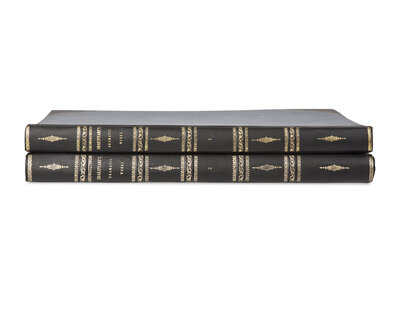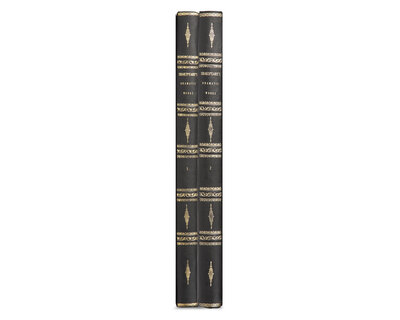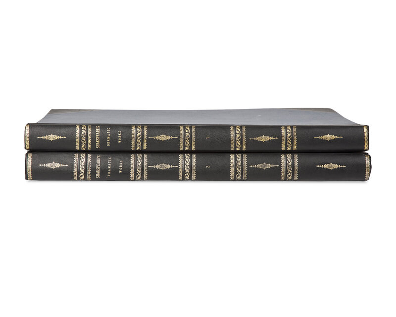 New-York: Restored and Published with Original Descriptions of the Plates by Shearjashub Spooner, 1852. In two volumes. First American edition. Double elephant folio, 28 3/8 x 21 1/2 in. (721 x 546 mm). Illustrated with two engraved frontispieces, engraved vignette on each title-page, and 96 engraved plates (each with tissue guards), after works by Romney, Fuseli, West, Kauffman, et al. 20th-century three-quarter black morocco over blue cloth-covered boards, decorated in gilt; marbled endpapers; dampstaining and old mold residue in bottom right corner of all leaves in first volume; dampstaining in top corner of all leaves in second volume; plate 71 repaired along bottom edge verso; scattered light to moderate foxing throughout each volume; most text leaves in each volume toned.