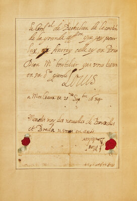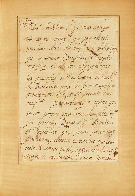 "I am sending you three of my musketeers, whom I have chosen to lead the companies at Philipsbourg...You can present them to my Cousin the Cardinal Richelieu. Speak to Messieurs de Bulion and Boutilier about giving '2 montres' to the Scotch Guard, which are due to them from last year, which is only just and right. Assure my Cousin the Cardinal Richelieu of the continuation of the great affection I feel for him...(P.S) Send me news of Brussels and Breda when there is any."