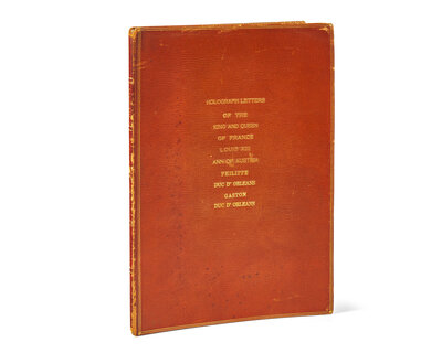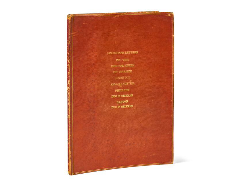 Creasing from old folds; scattered ink stains, remnants of wax seals; window-mounted to sheet, housed in brown straight-grain morocco folder, stamped in gilt, extremities worn and rubbed; green morocco book-plate of John L. Clawson mounted to front paste-down. Bound with: Anne of Austria, Manuscript Letter, signed September 9, 1650. 4 pp.; Gaston, Duc d'Orleans, Autograph Letter, signed. August 9, 1636. 1 p.; Philippe I, Duc d'Orleans, Manuscript Letter, signed. February 13, 1675. 4 pp. Each tipped-in, or window-mounted to sheets, with portrait engravings, English translations, or previous bookseller's descriptions. Condition varies.