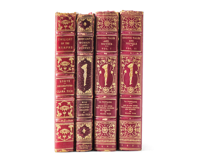 (New York): Pierre Louys Society, 1927. First and limited edition, 10 Deluxe/1,250 numbered copies. 8vo. Illustrated with 27 hand-colored plates, as well as 5 additional hand-colored etchings, by Tice. Full crushed red morocco, decorated in gilt, joints rubbed, endcaps and tips worn; top edge gilt, other edges untrimmed; marbled endpapers; book-plate of William R. Cabrera on front paste-down.