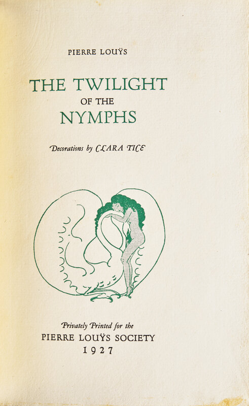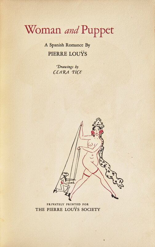 (New York): Pierre Louys Society, (1927). First and limited edition, #1/1,250 numbered copies. 8vo. Illustrated with 9 color plates, as well as 5 additional hand-colored etchings, by Tice. Three-quarter red levant over linen-covered boards, spine decorated in gilt and with tan leather onlay, joints and tips lightly worn; top edge gilt, other edges untrimmed; marbled endpapers; book-plate of William R. Cabrera on front paste-down.