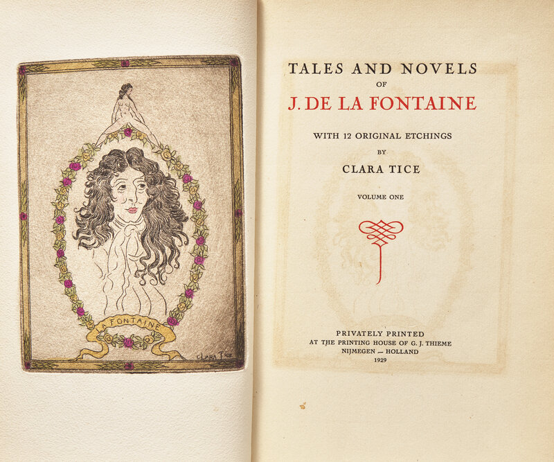 Nijmegen, Holland: Privately Printed at the Printing House of G.J. Thieme, 1929. In two volumes. First and limited edition, #2 of only five copies of the Choicest Falstaff Connoisseur Collectors sets, completely set by hand by Tice, and with two original signed crayon drawings and 12 hand-colored etchings, in both volumes, all signed by Tice. 8vo. With an etched limitation label, signed and numbered by Tice at front of each volume. Three-quarter red morocco over patterned paper-covered boards, spine decorated in gilt and with tan leather onlay, joints and tips lightly worn. Top edges gilt, other edges untrimmed; matching patterned endpapers; book-plate of William R. Cabrera on front paste-down.