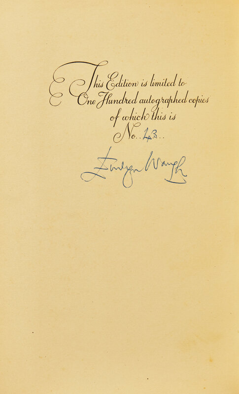 London: Saccone & Speed Limited, (1947). First and limited edition, #43/100 copies signed and numbered by Waugh. 8vo. 77, (1) pp. With two color illustrations by Rex Whistler. Publisher's maroon sheep, front board slightly bowed, boards lightly rubbed; all edges trimmed. Davis 22