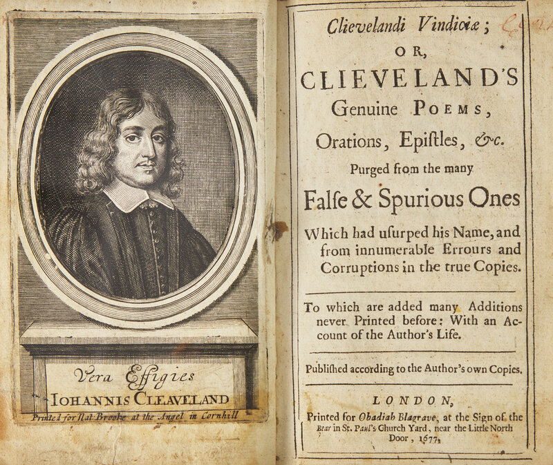 London: Printed for Obadiah Blagrave, 1677. First edition (issue with Blagrave's imprint). 16mo. Without front blank A1, as called for in Wither to Prior. Illustrated with an engraved frontispiece portrait of Cleveland, by Robert White. Full contemporary brown calf, red morocco spine label, decorated in blind and in gilt, front board starting, boards dry, extremities moderately worn; marbled edges; armorial book-plate of David Scott of Nether Benholm on front paste-down; contemporary inscription on front free endpaper and rear paste-down; old ownership signature on title-page in faded red ink; scattered light spotting and toning to text. Morris 27; Grolier, Wither to Prior 181.1; Wing C-4669; Lowndes, 481