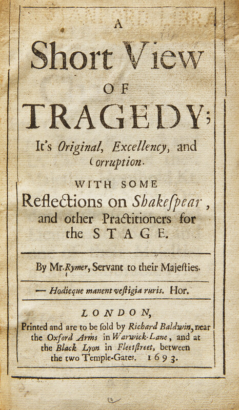 A Short View of Tragedy; It's Original, Excellency, and Corruption. With Some Reflections on Shakespear, and other Practitioners for the Stage