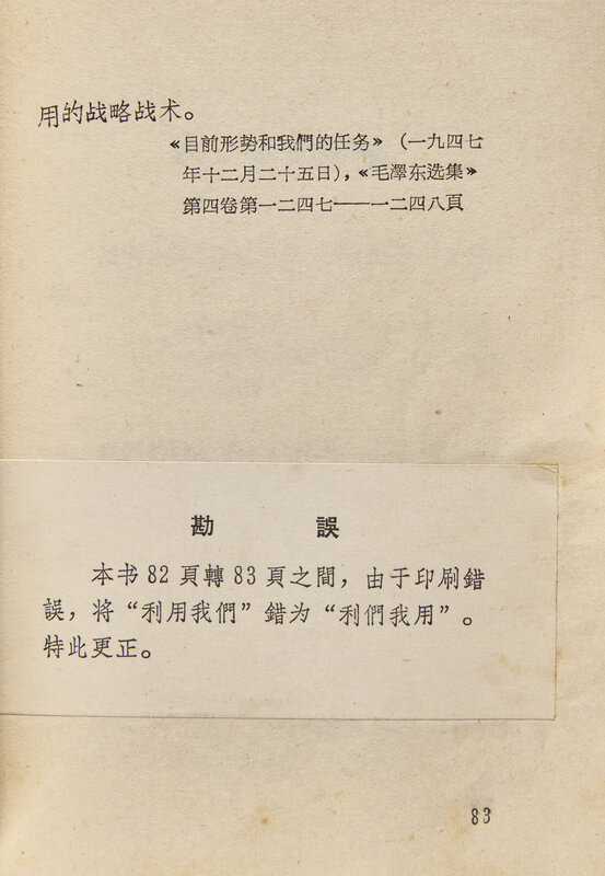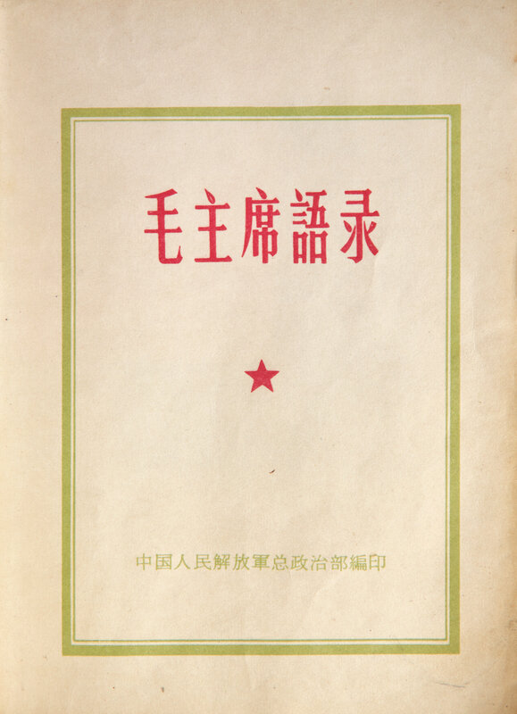 Rare first edition of Mao's iconic "Little Red Book", the influential pocket-size compendium of quotations and excerpts from speeches given by Mao on class struggle, communism, and other topics. This copy with Lin Bao's uncorrected calligraphic facsimile endorsement (Bao was head of national defense and Mao's intended successor), where a superfluous brushstroke occurred in the second vertical line from the right, second character from the top, which was corrected when the book was later printed. Following the "Lin Bao Incident" in 1971, when Bao died in a plane crash after he was accused of plotting to assassinate Mao as part of a political coup, people were encouraged to tear out Bao's endorsement leaf, and future copies were published without it. Only few surviving copies of this 1964 first edition have this leaf intact.