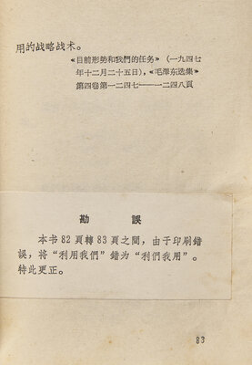 (Beijing): Printed and edited by the Central Intelligence Bureau of the Chinese People's Liberation Army, (June, 1964). First edition, earliest printed version (with Lin Biao's calligraphic endorsement printed in brown in the uncorrected state, and with text uncorrected at bottom of pp. 82-83, including rare errata slip pasted on p. 83). 12mo. (vii), 2, 2, 250 pp. Title-page printed in red and in green. Illustrated with a lithographic frontispiece portrait of Mao. Original flexible red vinyl wrappers (Schiller's binding B), stamped in blind; shallow tidemark in fore-edge of several leaves at front; some creasing in top corners of leaves at rear; scattered minor spotting to text. See Schiller, Quotations of Chairman Mao
