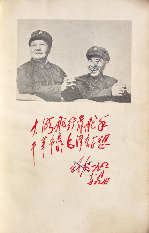 Vice-Chairman Lin Biao, one of Mao's closest confidants and his chosen successor, features prominently in this volume, from the portrait of him and Mao together at front to the section of "Quotations from Vice-Chairman Lin Piao [Biao]" on pp. 203-230. Following the "Lin Biao Incident" in 1971, when Biao died in a plane crash after he was accused of plotting to assassinate Mao as part of a political coup, a decree was issued that Biao's name was to be eradicated from history. Following this, most copies of this work were mutilated to remove reference to Biao, and as seen in this copy, the portrait of Lin, part of his facsimile manuscript, and other portions featuring his name are defaced, although the section of his "Quotations" remains unadulterated.