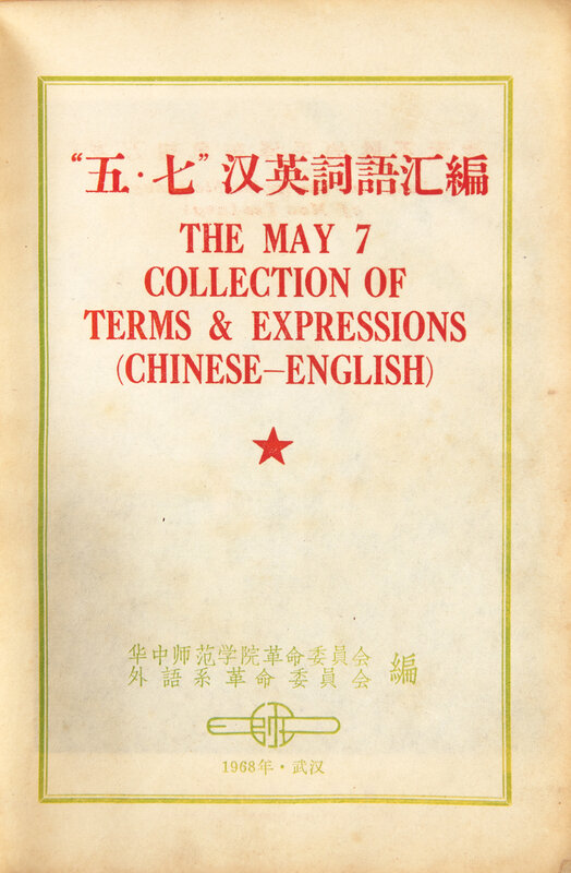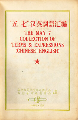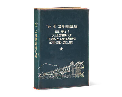 First and only edition of this very rare Chinese-English dictionary. One of only a small number produced to train high-ranking Chinese officers of the People's Liberation Army and Red Guards when dealing with foreign diplomats and newsmen, using terms, expressions, catch-phrases and slogans in the language from the Cultural Revolution. The title was taken from a speech made by Chairman Mao on May 7, 1966, in which he declared that all intellectuals should be re-educated by the peasantry. Sections include "Chairman Mao's Poems," "Chairman Mao's Eight Important Documents," "Collection of Terms and Expressions in Current Use," "Revolutionary Slogans in Constant Use," and more.