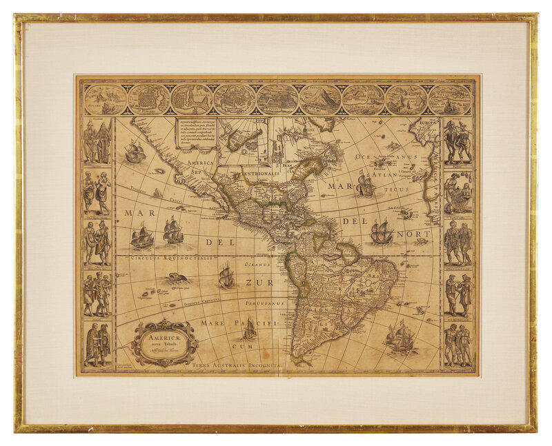 Strong impression of Dutch cartographer Willem Blaeu's map of the Americas. The sides are bordered with depictions of the native peoples of the New World, as well as plans of the towns of Havana, St. Domingo, Cartegena, Mexico City, Cusco, Potosi, Mocha Island in Chile, Rio de Janeiro, and Olinda in Brazil.