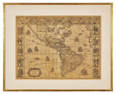 (Amsterdam: ca. 1631). Third state. Partially hand-colored engraved map of North and South America, from Blaeu's Atlas Appendix. Approximately 16 3/4 x 22 1/2 in. (425 x 571 mm) (sight). Creasing from old folds; scattered foxing; unevenly toned. In mat and unexamined out of frame, 23 1/4 x 29 in. (590 x 737 mm). Burden 189; Tooley, p. 297