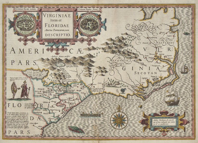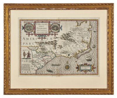 Hand-colored map of the of Virginia and Florida by Jodocus Hondius, first published in 1606 in Mercator's Atlas sive Cosmographicae. Hondius's map was drawn using two important source maps, those by John White and Jacque le Moyne, and became the prototype for maps of the region in the first half of the 17th century.