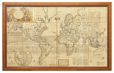 (London): H. Moll, J. King, John and Tho. Bowles, 1719 (but ca. 1730). Large engraved folding map with hand-coloring, comprising four joined sheets, completely mounted to wooden board. Sheet toned; soiling along folds; wear along edges. Approximately 28 1/2 x 47 7/8 in. (724 x 1216 mm). In frame, 31 3/4 x 50 1/2 in. (806 x 1283 mm).