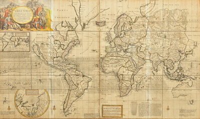Herman Moll's monumental map of the world, charted on the Mercator projection, and depicting the routes of famous explorers of the period.