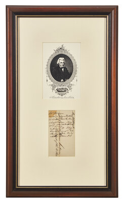 No place, ca. 1830. One folded sheet, being an autograph letter by U.S. Congressman Henry Horn, with an autograph note, initialed by President Andrew Jackson on verso, forwarding Horn's recommendation for the office of Chaplain of the Philadelphia Naval Yard, dated October 5th, 1830. 5 x 3 in. (127 x 76 mm) (sight). In mat and with an engraved portrait of Jackson, and in frame, 20 x 11 1/2 in. (508 x 292 mm).