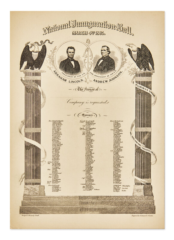 (Washington, D.C.): Engraved by Dempsey & O'Toole, after a design by Joseph Goldsborough Bruff, 1865. Engraved invitation with jugate portraits of Lincoln and Andrew Johnson at top, 10 7/16 x 7 1/2 in. (265 x 190 mm).
