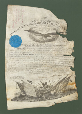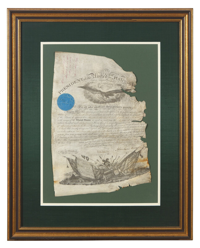 Washington, May 24, 1864. Partially-printed military commission on vellum, signed by Abraham Lincoln as President of the United States, appointing Medal of Honor recipient Charles Amory Clark Assistant Adjutant General of Volunteers; counter-signed by Secretary of War Edwin Stanton. Blue seal intact in top left; manuscript in red ink, signed by the Assistant Adjutant General registering the document. Worn; sheet distorted; heavy loss along right side, affecting text, but not signature. In mat and in frame, 29 x 23 1/2 in.