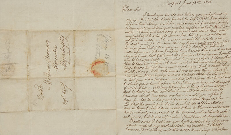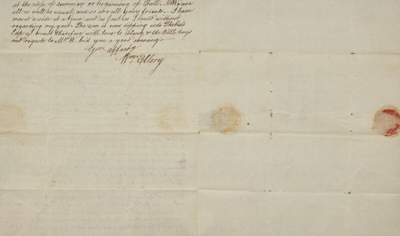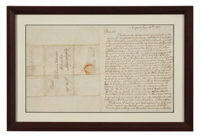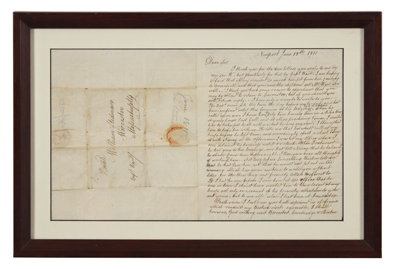 Newport, Rhode Island, June 18, 1811. One sheet folded to make four pages, 8 x 13 1/4 in. (203 x 337mm). Autograph letter, signed by William Ellery, Signer of the Declaration of Independence, for Rhode Island, to his son-in law William Stedman; addressed by Ellery on verso, docketed in pencil in another hand to same. Creasing from old folds; light offsetting from wax seal. In mat and in double-pane glass frame, 11 1/8 x 16 5/8 in. (282 x 422 mm).