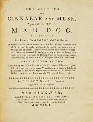 [Science, Medicine & Mathematics] Dalby, Joseph. The Virtues of Cinnabar and Musk, Against the Bite of a Mad Dog