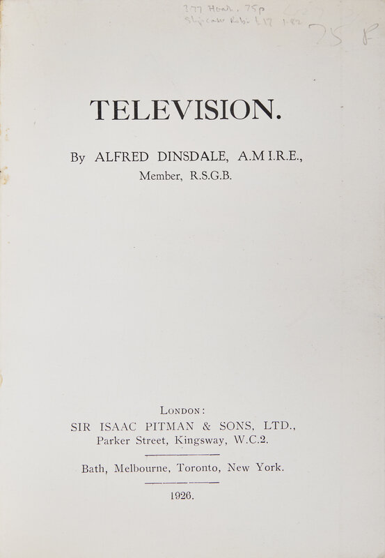 First edition of the first book printed in English on the television. While Dinsdale discusses his own ideas, the work mainly focuses on the work of Scottish engineer John Logie Baird, who was the first to successfully transfer recognizable human faces between two televisions.