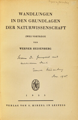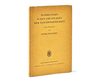 Leipzig: Verlag Von S. Hirzel, 1935. First edition. Presentation copy, inscribed in the year of publication by Heisenberg to Dr. Martin Gumpert: "Herr Dr. Gumpert mit / herrlichem dank / Werner Heisenberg / Nov. 1935." Original stiff yellow printed wrappers; ownership blind stamp on title-page of economist Karl H. Niebyl; later inscription on verso of title-page noting the book's acquisition from Gumpert's daughter, Nina: "From Nina Gumpert-Parris, after the death of her father...1955"; annotations and underling in red, green, and blue ink. Cassidy, p. 16 i