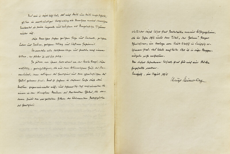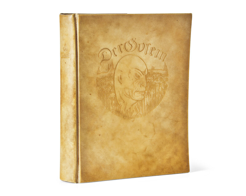 Leipzig: Kurt Wolff, (1915). Deluxe edition. 4to. 343, (1) pp. Illustrated with 25 lithographic proofs by Hugo Steiner-Prag, each signed, dated (1916), and titled and notated ("Probedruck") by him in pencil, plus an additional lithographic title-page (unsigned). With a seven-page autograph manuscript, signed by Steiner-Prag, bound in at front, dated April 1918, regarding his work on this publication. Publisher's deluxe full pictorial vellum, decorated in gilt with an image of the Golem on front board, boards warped; top edge gilt, other edges trimmed; patterned endpapers; illustrated book-plate of German art collector and bibliophile Leo Lewin (1881-1965) on verso of front free endpaper; sheets lightly toned.