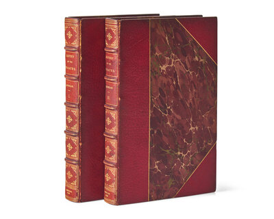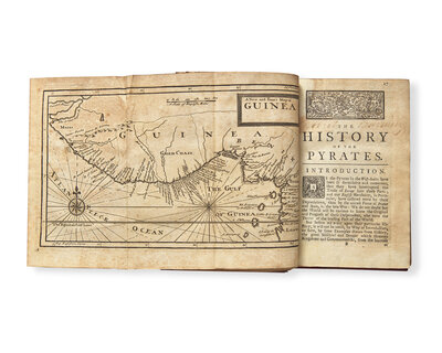 London: Printed for, and Sold by T. Woodward, 1726-(28). In two volumes. The Fourth Edition. 8vo. (xx), 17-443; (xiv), 413, (3, ads) pp. (some erratic pagination). Illustrated with one folding engraved map and two (of three) engraved plates, including: A New and Exact Map of Guinea, Blackbeard the Pirate, and Ann Bonny and Mary Read; without folding plate depicting Captain Roberts and two of his ships. Three-quarter crimson levant over marbled paper-covered boards, decorated in gilt, light wear to joints; top edges gilt, other edges trimmed; matching marbled endpapers; soiling and repairs to title-page of first volume; faint ownership signature on p. 17 in first volume, same signature at top of title-page in second volume; scattered soiling and dampstaining to text; bottom corner P2 in second volume repaired; old manuscript notes on verso of final text leaf in first volume; text in both volumes presumably sometime washed. From the library of Americana collector and bibliophile Amor L. Hollingsworth, and with his gilt armorial book-plate on front paste-down of each volume. Gosse, My Pirate Library, p. 47; ESTC T71966