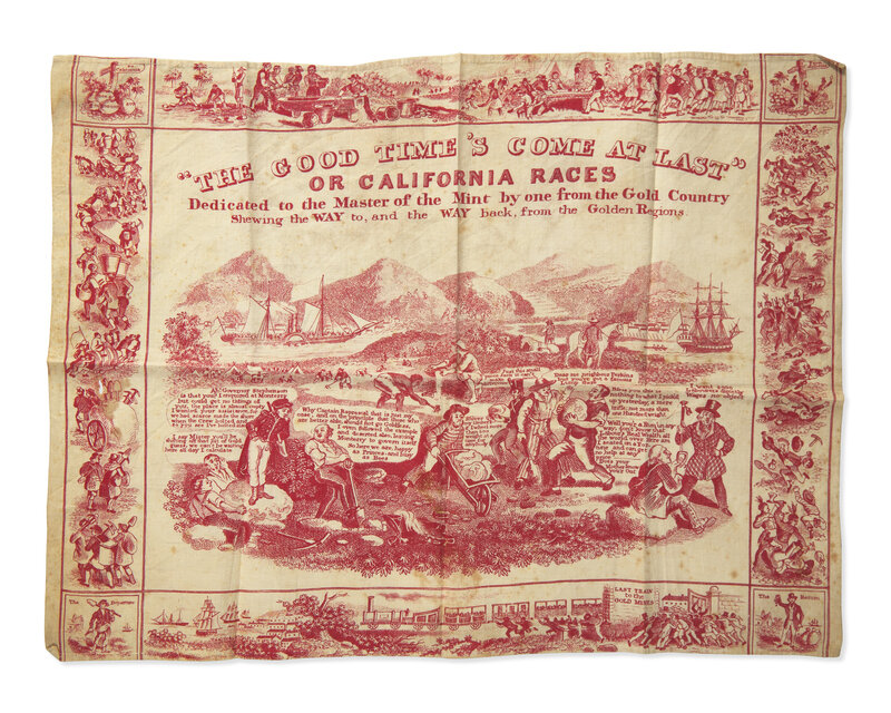 A rare satirical handkerchief depicting the California Gold Rush. Titled after a popular contemporary comic song written on the Gold Rush, this handkerchief depicts the gold fever that gripped the nation, showing people of all stripes, such as top-hatted capitalists and gold-seeking "forty-niners", digging, panning, and hauling gold. Bordered with vignette scenes showing crowds clamoring to travel to the Gold Mines, by foot, by sea, and by train, scenes of figures carrying mining tools such as picks, shovels, and bundles, and more violent altercations between gold rushers and Native Americans.