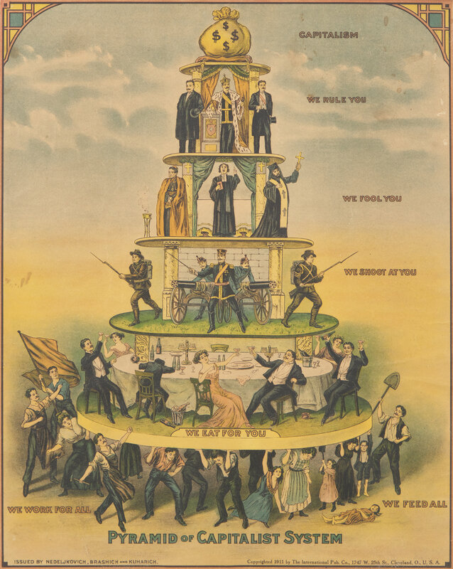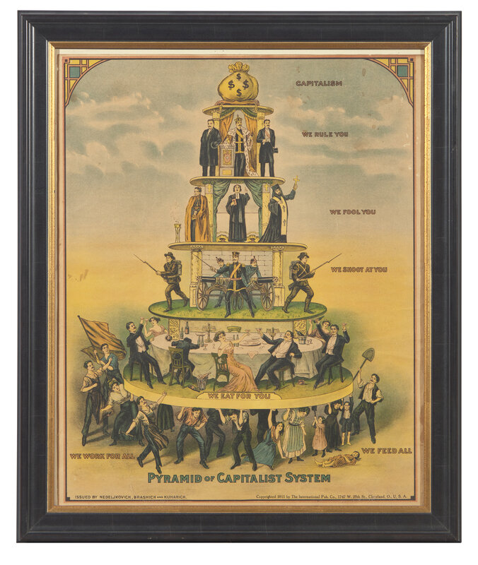 A very rare and original example of this popular anti-capitalist poster. Based on a Russian flyer from 1901 designed by Nicolas Lockhoff, this poster was published in America in 1911 by The International Pub. Co., publisher's of the Industrial Worker (the mouthpiece for the radical trade organization, the Industrial Workers of the World) and issued by the Cleveland firm of Nedeljkovich, Brashich, & Kuharich.