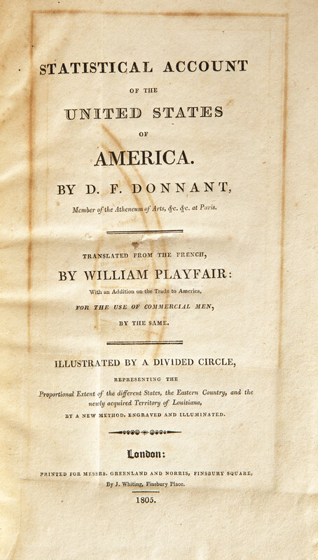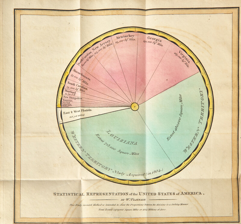 Rare statistical analysis of the United States during Jefferson's presidency, featuring one of the earliest uses of a pie chart, illustrated by its inventor, the Scottish engineer, William Playfair (1759-23). Playfair is considered the father of statistical graphics, and single-handedly invented the pie, line, and bar charts. His first use of a pie chart occurred four years prior to this volume, in his Statistical Breviary (1801). Playfair's chart here represents the total area of the United States in square miles, divided into proportional sections, and distinguished by color to represent each state, the territories, and Spanish-held possessions.