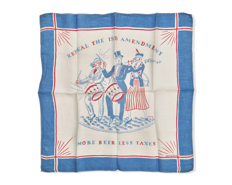 (New York): Peck & Peck, (ca. 1933). Blue and red printed cotton handkerchief , depicting three marching figures, with printed text "Repeal the 18th Amendment / More Beer Less Taxes", signed "E.A.W." Creasing from when folded; light wear in bottom left. 17 x 16 in. (432 x 406 mm). Collins, Threads of History 1089