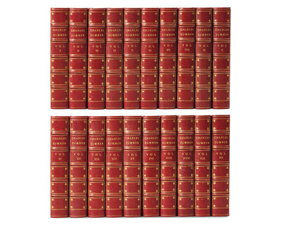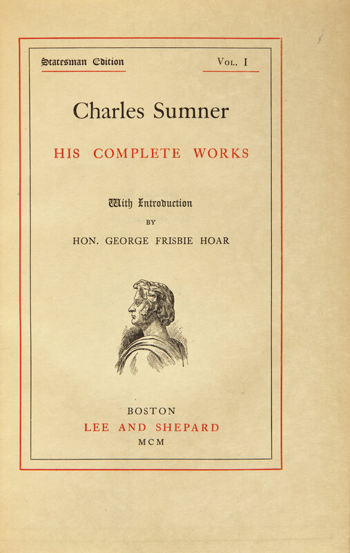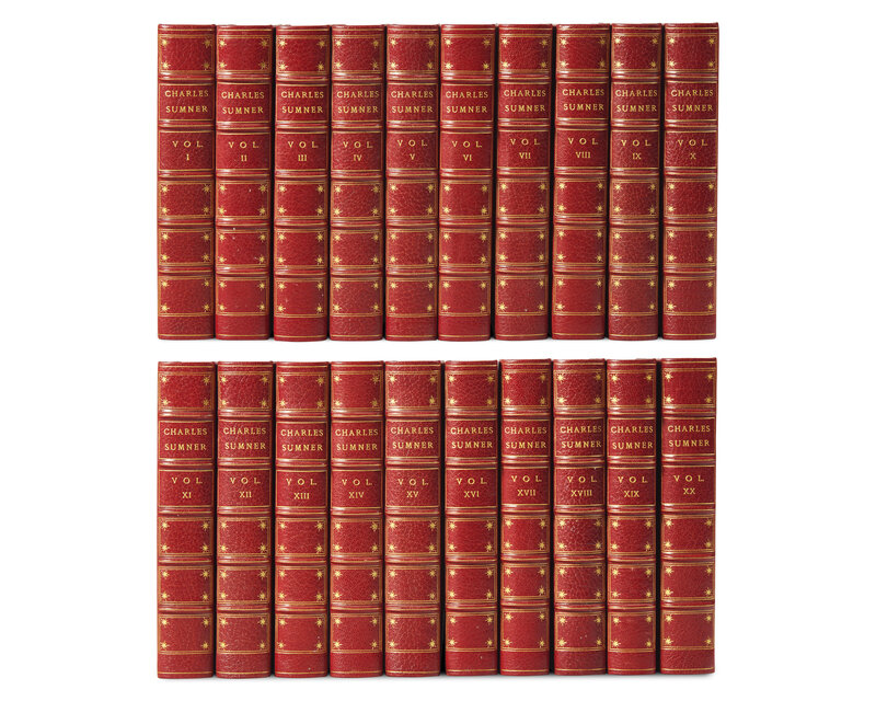 Boston: Lea and Shepard, 1900. In 20 volumes. Statesman Edition, #391/1000 numbered sets. 8vo. With a three-page autograph letter, signed by Sumner to the Rev. R.C. Waterston, undated (but ca. 1846), bound in at front of first volume: "Yesterday I read the enclosed account, which will explain itself. It seems to me rather hard that I should be left in the lurch by our committee, & particularly by individuals on it who have never contributed their full quota, & who are themselves rich, too. I have so far neglected my worldly affairs during these latter years, & have been called upon so frequently for contributions, that I am less able than any member of the committee to pay this deficiency out of my own pocket. Nor do I think it just that Mr. Brigham, or Mr. Brooks, or Mr. Thayer, all of whom were originally responsible with me, and who have not contributed their full share, should let this be cast upon me. I have had the labor & responsibility of carrying the matter through--as far as it has gone, & secured contributions much beyond my portion. It seems to me, therefore, that I may properly devolve upon the members of the committee above named the duty of meeting this deficit. Upon you there is no claim; for you have already supplied more than your share but I submit the account to you, & ask your advice as to the course to be pursued. Ever sincerely yours, Charles Sumner." Three-quarter red levant over marbled paper-covered boards, spines stamped in gilt; top edges gilt, other edges untrimmed; matching marbled endpapers.