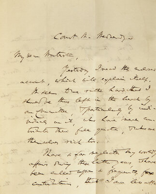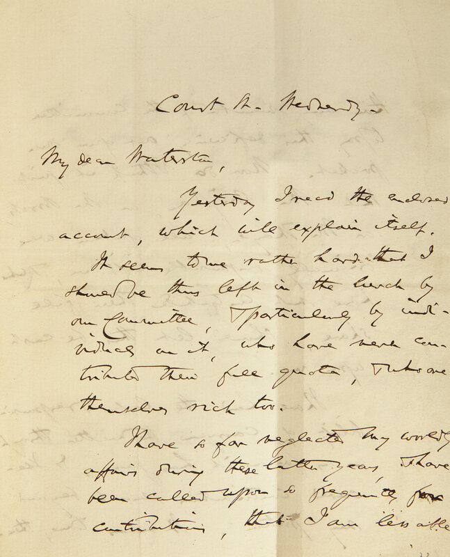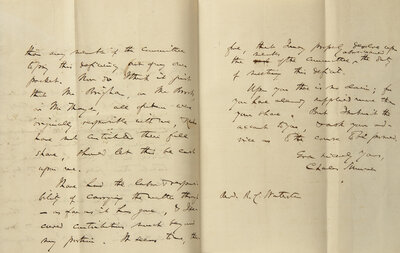 Republican Senator Charles Sumner writes to the Reverend Robert C. Waterston, regarding a commitment made to raise money for the public school system in Massachusetts, a cause Sumner championed alongside famous education reformer Horace Mann (1796-1859).