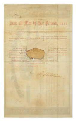 New York, June 26, 1858. Partially-printed American Express Company stock certificate (No. 3273), for five shares, signed by company president Henry Wells and company secretary William G. Fargo, and issued to D.F. Williams; counter-signed by company treasurer Alex Holland; endorsed on verso by Williams. Creasing from old folds; unevenly toned; loss at center (affecting text but not Wells' or Fargo's signatures) with old crude repair on verso.