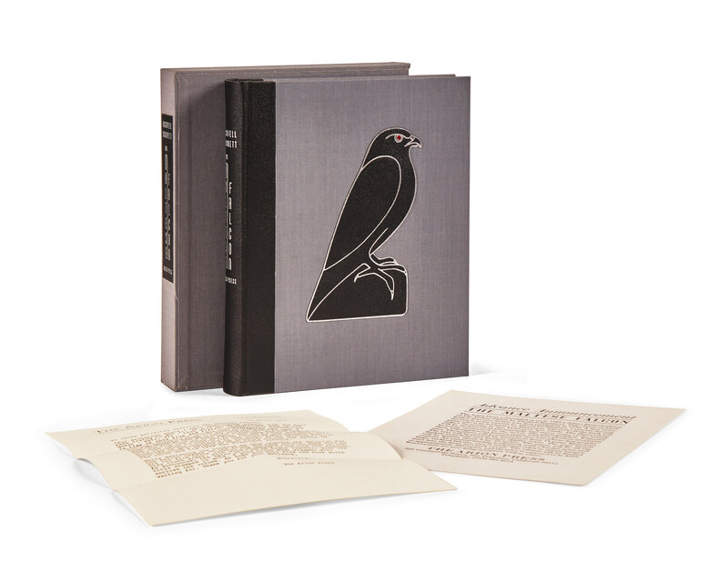 San Francisco: The Arion Press, 1983. First edition thus (one of 400 copies). 4to. ix, (i), 291, 92) pp. Illustrated with a tipped-in portrait of Hammett, folding panoramic view of New York, and photographic reproductions. Publisher's quarter black morocco over grey cloth-covered boards, black morocco onlay of the Maltese Falcon on front and rear board, stamped in red and in silver, spine lettered in silver; all edges trimmed; illustrated endpapers; in original matching grey cloth slip case. Original prospectus laid in.