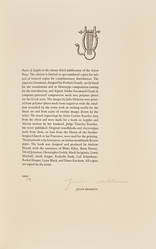 [Arion Press] [Mehretu, Julie] Poetry of Sappho