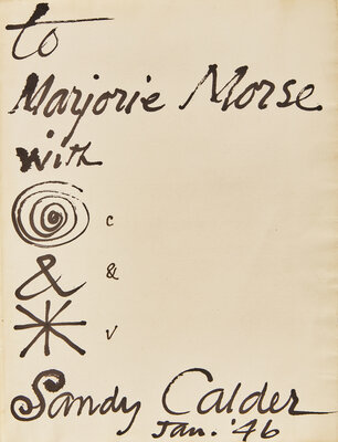 New York: Published by Curt Valentin, 1944. First edition, one of 700 copies (from a total edition of 760). Presentation copy, boldly inscribed by Calder, filling entirety of the front free endpaper: "to / Marjorie Morse / with / c / & / v / Sandy Calder / Jan. '46", with three large symbols by him. Folio. xviii, (iv), 130, (vi) pp. With numerous illustration by Calder. Publisher's quarter oatmeal cloth over yellow paper-covered boards, pictorially stamped in red; in original dust-jacket, front panel and flap separated, spine panel browned, scattered edge wear.