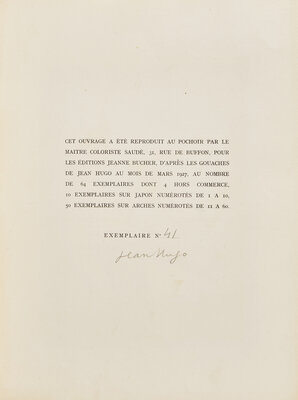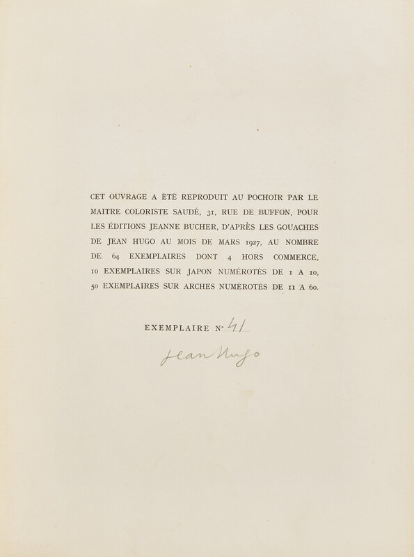 (Paris): Jeanne Bucher, 1927. First and limited edition, #41/50 numbered copies on Arches paper (from a total edition of 60), and signed and numbered by Hugo in pencil on colophon. Folio. Illustrated with 20 numbered pochoir plates, loose as issued, by Jean Saude, after gouaches by Hugo. Publisher's quarter drab buckram over paper-covered board portfolio, printed cover label, silk ties intact; some light offsetting to colophon and plates.