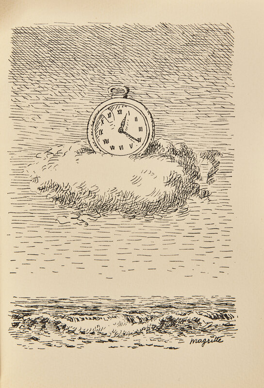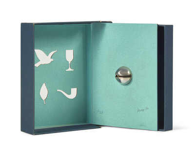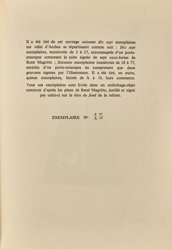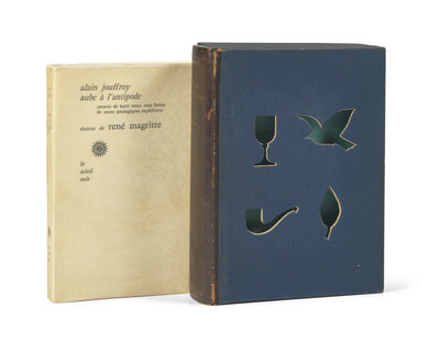 (Paris): Le Soleil Noir, (1966). First and limited edition, #15/17 numbered copies (from a total edition of 77). 8vo. With illustrations by Magritte. Publisher's stiff creme printed paper wrappers; in original glassine; text unopened; in original Magritte-designed fall-down-back box, front panel with cut-out emblems, with inner flap with metallic bell, signed by Magritte on inner flap; leather pull separated but present. Lacking the portfolio of seven signed etchings.