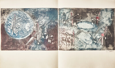Lausanne: Editions Meyer, (1962). Limited edition, exemplaire No. 53 of 80 copies on Rives paper (from a total edition of 125). Elephant folio. With letterpress text and illustrated with 25 etchings (including three double-page), all but four in color, and 16 signed by Matta. Text and plates loose as issued in printed paper wrappers; in original oatmeal cloth chemise and slip case, printed paper spine labels on chemise; toning on front wrapper.