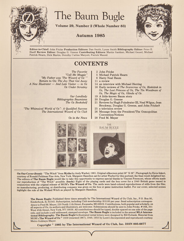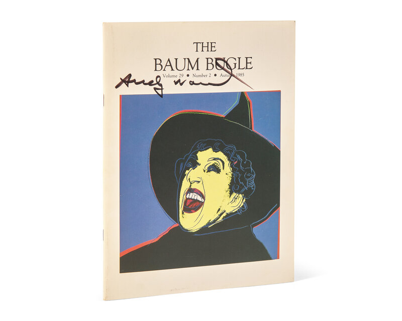 Kinderhook, Illinois: The International Wizard of Oz Club, Inc., 1985. Volume 29, Number 2, Autumn 1985. Signed by Andy Warhol on front wrapper. 4to. 28 pp. Original pictorial wrappers, with a reproduction of Warhol's screenprint "The Witch" on front wrapper; several sheets of International Wizard of Oz Club ads laid in.
