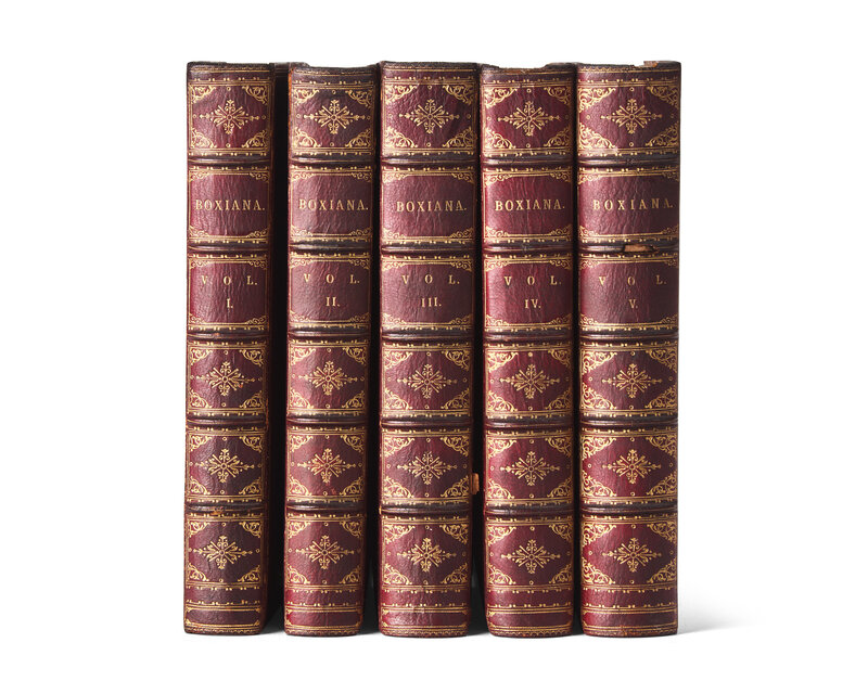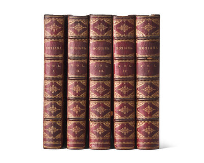 A near-complete set of this classic work on boxing. Boxiana first appeared in parts and as a single volume in 1812 by publisher George Smeeton. Later, between 1818 and 1821, Pierce Egan, a journalist and one-time compositor in Smeeton's office, produced three volumes under publisher Sherwood, Neely, and Jones. Much of the material and plates for these were taken directly from Smeeton's 1812 edition. Due to a legal dispute between the publishers and Egan, the fourth volume was published in 1824, in part or full, by sports journalist John Bee (Babcock). Following a court battle in 1828, Egan was allowed to continue to publish under the title Boxiana, so long as he appended the qualifier "New Series". Under this title he then published two more volumes in 1828 and 1829. Subsequent collected editions then followed into the 19th century.