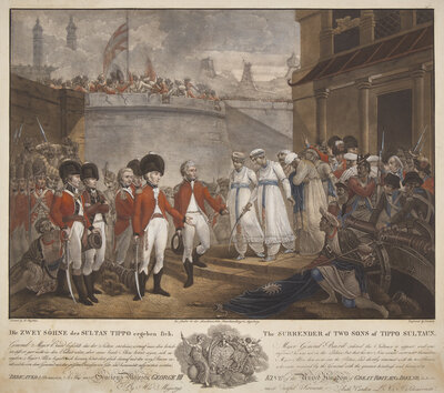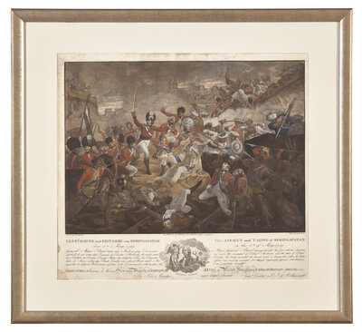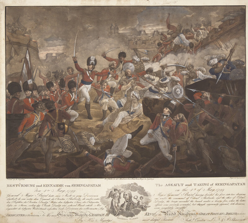 Pair of hand-colored engraved scenes by London-based engravers Anthony Cardon and Luigi Schiavonetti, from a four-part series depicting key events from the Fourth Anglo-Mysore War (1798-99).
