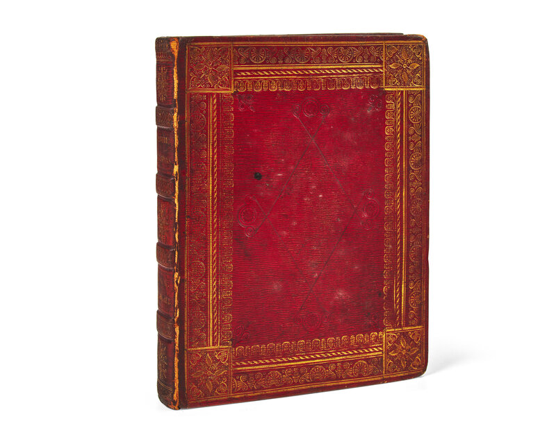 London: Published by Allen & Co., (ca. 1814). Later issue. 4to. (ii), iv, (iii)-iv, v-217, (1) pp. (text leaves variously watermarked 1794, 1799, and 1806); Contents leaf (A2) bound after B2. Illustrated with a hand-colored engraved frontispiece, engraved title-page, and 99 hand-colored engraved plates (three folding), by Isaac Cruikshank after Woodward (frontispiece dated 1807, but plates variously watermarked Willmoth and dated 1808-10). Full contemporary English crimson straight grain morocco, elaborately stamped in blind and in gilt, joints lightly worn, boards lightly worn, spine slightly darkened; all edges gilt; gilt morocco book-plate of Valentine Hollingsworth on front paste-down; contemporary ownership signature on front free endpaper (E.G. Ashby); small abrasion at bottom of title-page from when printed year rubbed out; scattered soiling to text, light offsetting from plates onto same; wear along folds of folding plates.