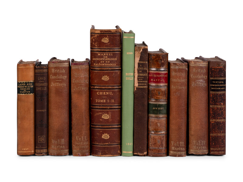 BROWN, Thomas (1785-1862). Illustrations of the Recent Conchology of Great Britain and Ireland. London: Smith, Elder, & Co., [n.d.]. -- CHENU, Jean-Charles. Manuel de Conchyliogie et de Paleontologie Conchyliologique. Paris: Librairie Victor Masson, 1859. -- JEFFREYS, John Gwyn (1809-1885). British Conchology. London: John van Voorst, 1862. 5 volumes. -- RIMMER, Richard. The Land and Freshwater Shells of the British Isles. London: David Bogue, 1880. -- SOWERBY, George Brettingham (1788-1854). A Conchological Manual. London: Henry G. Bohn, 1852. -- TURTON, William (1762-1835). A Conchological Dictionary of the British Islands. London: Printed for John Booth, 1819.