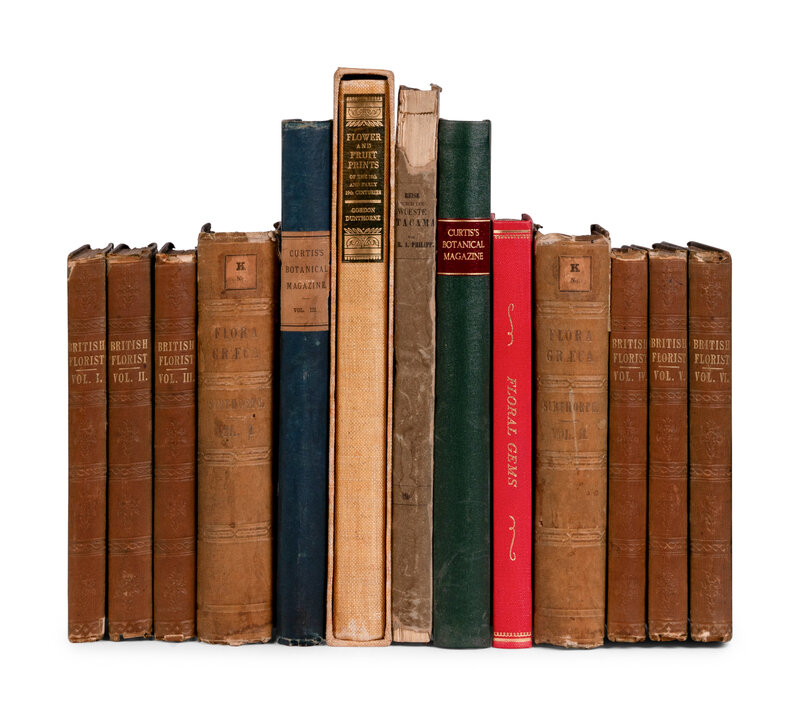 CONDER, Josiah (1852-1920). The Floral Art of Japan. Tokyo: Kelly and Walsh, Limited, 1899. -- DUNTHORNE, Gordon. Flower and Fruit Prints of the 18th and Early 19th Centuries. Washington: The Author, 1938. -- HETLEY, Georgina (1832-1898). The Native Flowers of New Zealand. London: Sampson Low, Marston, Searle, and Rivington, 1888. -- PARSONS, Samuel Bowne, Jr. (1819-1906). The Rose: Its History, Poetry, Culture, and Classification. New York: John Wiley, 1849. -- PRETTY, Edward (1792-1865). A Practical Essay on Flower Painting in Water Colors. London: D.N. Shury, 1810. -- SWEET, Robert (1783-1835). Floral Gems. London: G. Willis, [n.d.]. -- THOMSON, James (1700-1748). The Seasons. London: John Murray, 1778.
