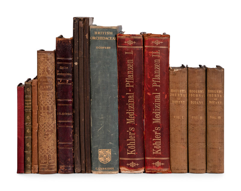 GODFREY, Michael J. Monograph and Iconograph of Native British Orchidacaeae. Cambridge: The University Press, 1933. FIRST EDITION. -- HOOKER, William Jackson. The Journal of Botany. London: Longman, Rees, Orme, Brown, Green, & Longman, et al, 1834-1842. 4 volumes.-- JOHNSON, Charles. British Poisonous Plants. London: Taylor and Francis, 1856. -- KOHLER, Hermann Adolph. Kohler's Medizinal-Pflanzen. Gera-Untermaus: Franz Eugene Kohler, [1887]. 2 volumes. FIRST EDITION. -- LAWSON, George. The Royal Water-Lily of South America. Edinburgh: James Hogg, 1851. -- SOWERBY, Charles Edward. An Illustrated Catalogue of British Plants. London: Printed for the Author, 1841. -- STRUTT, Jacob George. Sylva Britannica or, Portraits of Forest Trees. London: Published for the Author by Longman, Rees, Orme, Brown, and Green, [n.d.]. -- CASTILLO, Emmanuel Drake del. Illustrationes florae insularum Maris Pacifici. Paris: G. Masson, 1886-1892. 6 (of 7) volumes, 4to. 30 plates only (of?). FIRST EDITION. INSCRIBED BY THE AUTHOR TO J.M. COULTER (1851-1928), head of the Department of Botany at the University of Chicago.